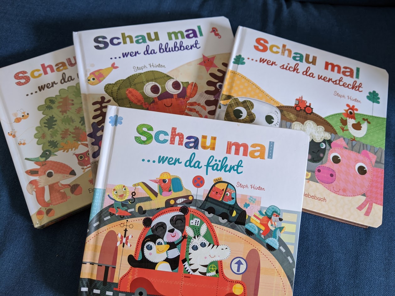 Aktuell arbeite ich im Homeoffice statt im Büro. Dort steht ein Regal voller Belegexemplare aus den bisherigen Jahren und lässt mich in Erinnerungen an alte Projekte schwelgen – darunter die Kinderbuchreihe „Schau mal“.